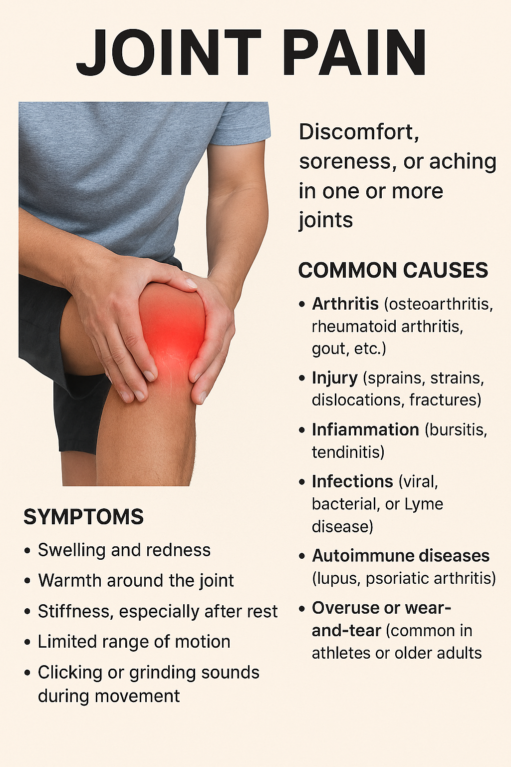 Swelling: Joint may feel warm or appear enlarged.